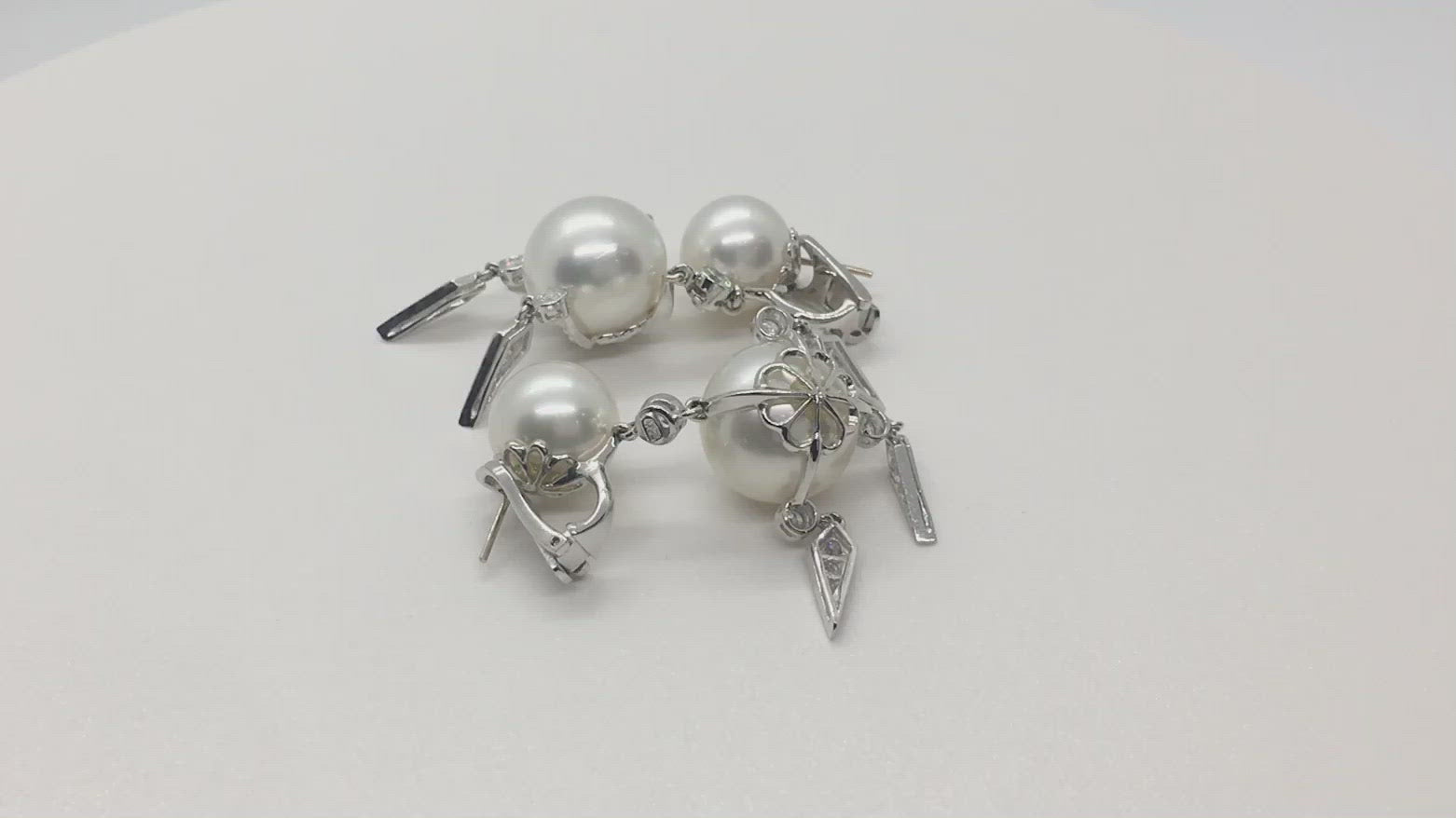 Pair of impressive 18k white gold earrings by Assael for Prince Dimitri, set with 11.7mm and 14.1mm South Sea pearls and 1.06ctw in G/VS diamonds. Retail $11300.