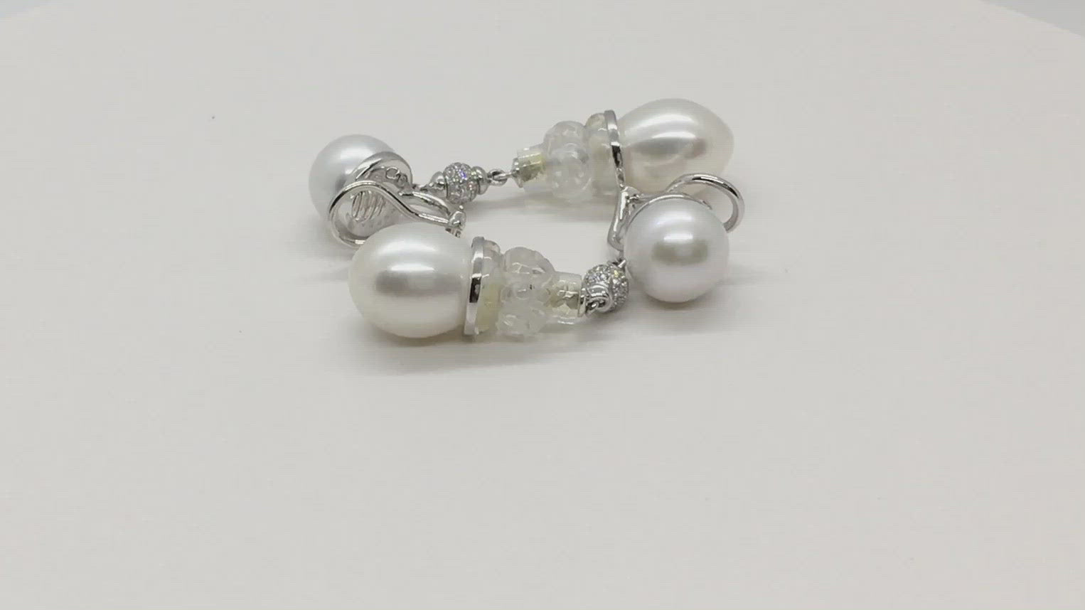 Pair of 18k white gold drop earrings by Seaman Schepps, set with pearls, approx. 0.30ctw in diamonds and carved rock crystal.