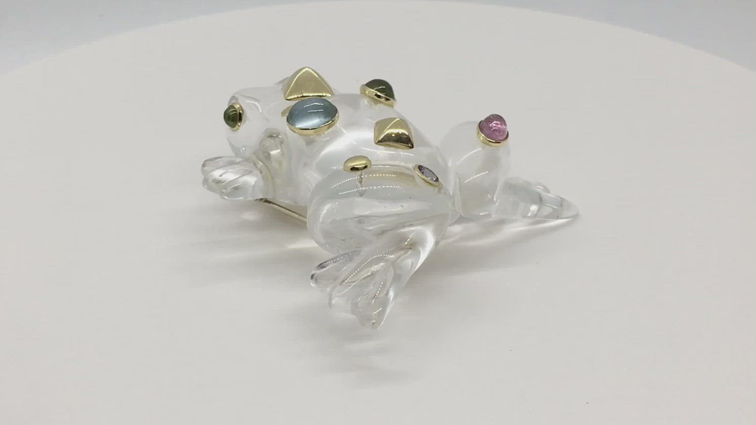 18k god and carved crystal frog brooch by Seaman Schepps, adorned with tourmaline, aquamarine and iolite gemstones.